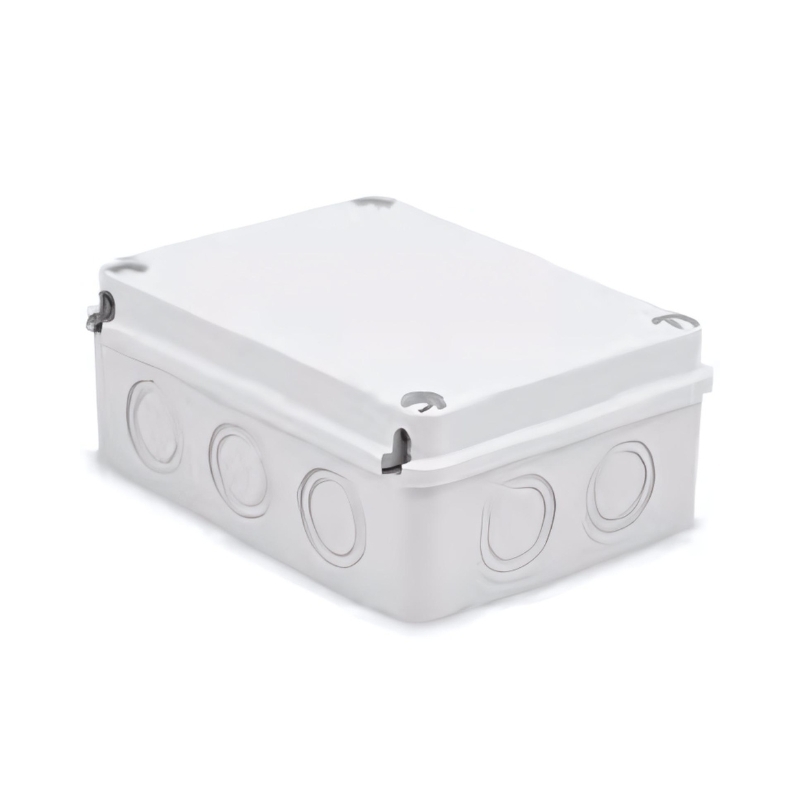 Разклонителна кутия за открит монтаж с плоски мембрани и размери 100×100 x50mm, степен на защита IP65, цвят Сив с капак и пластмасови винтове, сертифицираност по EN 60670-1/EN 60670-22, EN 60754-1, 2022/95/EC RoHS, пожароустойчив продукт, UV – защита